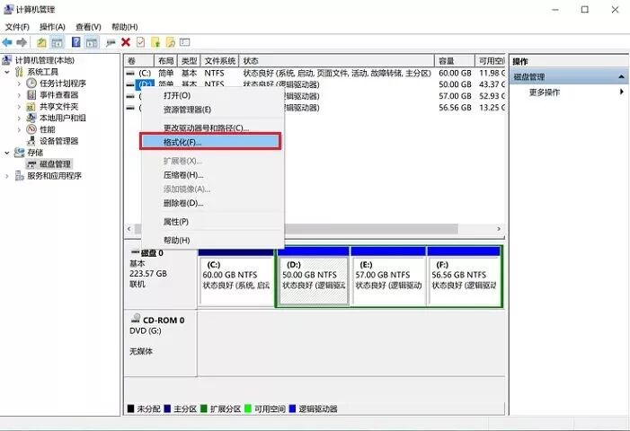 2. 在打开的“计算机管理”界面中,单击左侧的“磁盘管理”,然后在右侧找到需要4K对齐的SSD驱动器号,右键单击它,然后选择“格式化”. 如图所示.