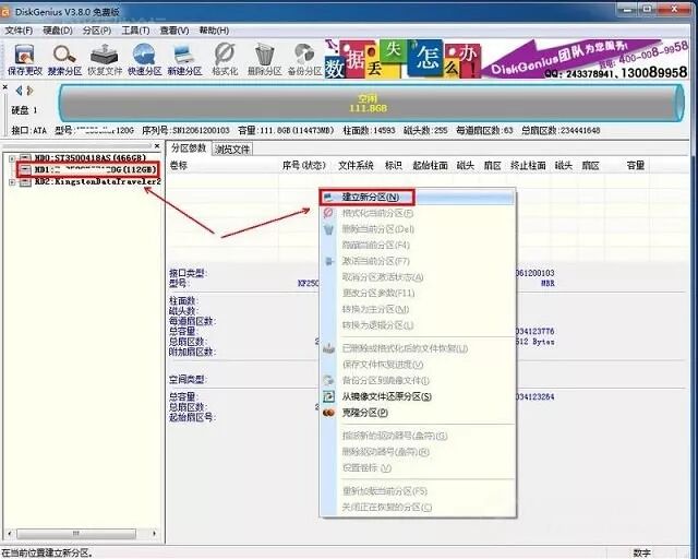 首先,在计算机或PE工具中打开DiskGenius软件,然后在左侧,选择需要分区的新硬盘,然后您可以看到顶部的灰色条处于空闲状态,右侧-单击灰色栏,然后选择“创建新分区”,如图所示.