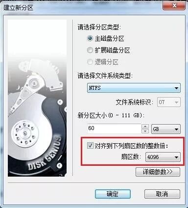 有两种类型的硬盘分区. 如果要安装系统分区,则必须选择主磁盘分区,并且分区大小是所需的大小. 接下来的一点是检查底部对齐检查“至以下扇区号的整数倍”,然后在下面的扇区数中选择“ 4096(您也可以选择2048)”,然后确保4K对齐为可能,如图所示.