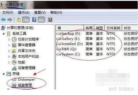 2。弹出计算机管理窗口后,我们可以在左侧看到“磁盘管理”选项卡。单击“磁盘管理”选项卡后,计算机磁盘的分区信息将显示在右侧
