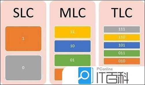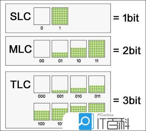 TLC =三级单元,即3位/单元,每个单元可存储的数据比MLC多出1/2,总共8个充电值11 1、 11 0、 10 1、 01 1、 01 0、 00 1、 000。最大的特点是速度慢,寿命短,擦除和写入寿命约为500-1000次,但价格是这三种产品中最低的。