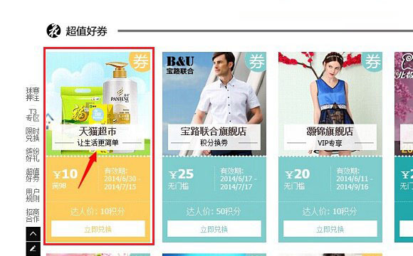 之后即可成功领取10元天猫超市优惠券了,只需10积分,即可领取10元优惠券,还是非常超值的。积分上,大家在天猫上买过东西就会有积分,经常网购的朋友,10积分并不多。另外领取的超市优惠券有时间限制,领取后,比如在五天之后,在天猫超市用完,否则就失效了,如下图所示: