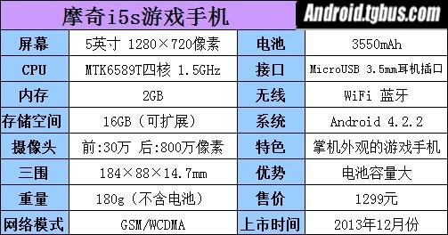 如今的摩奇i5s在屏幕尺寸、分辨率、电池容量、机身三围和重量上并没有改变,这使它保留了i5较好的画质、舒适的手感和超长的待机时长。摩奇i5s搭载了MTK6589T四核1.5GHz的处理器,比之前的主频高了0.3GHz,让它的游戏性能有所提升。它还提升了一倍的机身的运行内存和存储空间,让用户玩游戏时更流畅,也能安装更多的大型游戏。