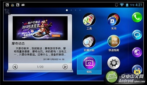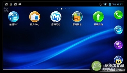 摩奇i5s的系统与上一代的i5并无区别,都是采用安卓4.2.1系统,并经过自己的优化,非常适合游戏体验。在解锁界面和桌面上,它是横屏显示的,这让用惯了安卓手机竖屏显示的用户有些不习惯,但这样的设计比较适合游戏体验,用户也会慢慢适应的。