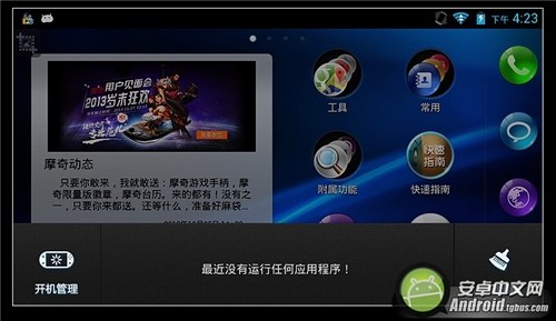 长按Home键可以呼出最近任务程序,并且右下角拥有一键清理功能,防止后台运行程序太多而拖慢游戏速度。在左下角还有开机管理,防止一些游戏附带程序开机自动运行。可以说摩奇i5s是专门为游戏优化的,各种有利于游戏体验的功能它都考虑到了。