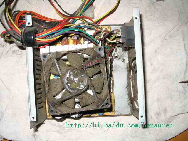 四、拧掉螺丝,小心拆掉外壳,会看到电源盒内部的情况,注意,风扇已积满了灰尘。