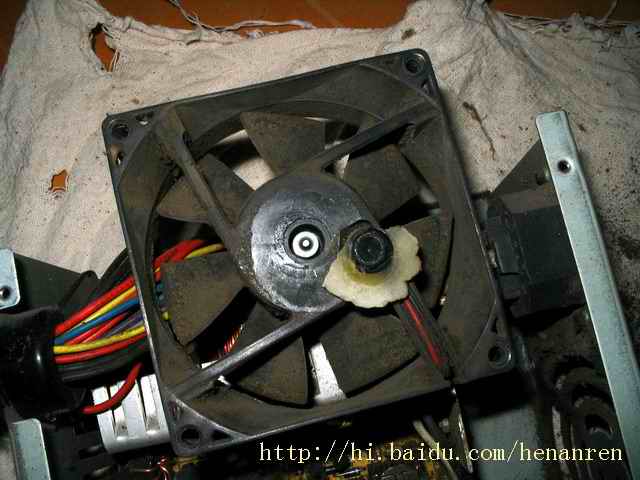 五、来一个清晰的风扇写真(我的风扇以前加过油,那个封口的塑料膜没有了,有很多石蜡滴在上面,等会儿我告诉你为什么要滴石蜡。电源风扇噪音大电源风扇噪音大)