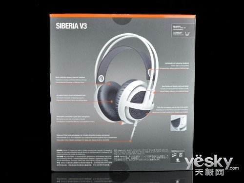 赛睿西伯利亚V3耳机包装盒为橙黑色调,正侧面印刷白色耳机主体。