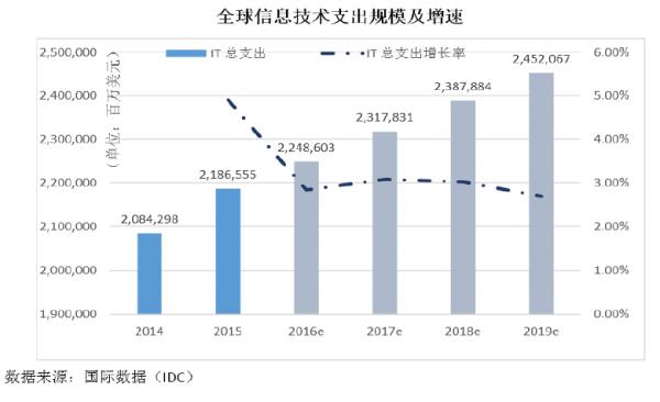IT供应链服务行业与全IT行业的整体环境息息相关。近年来,全球IT支出虽呈现放缓的趋势,但仍维持稳健的增长,增速预计在3%左右。同时,2016年中国IT市场支出规模预计可达到2.31亿元。
