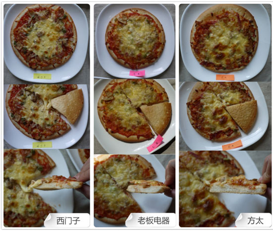 设定同样的烘烤时间、温度后,老板烤箱R015烤出来的饼身组织膨发得很不错,口感很松软,奶酪没有出现焦斑。老板烤箱r015其余两款产品做出来的披萨都有口感不松软或者奶酪出现斑驳的现象。