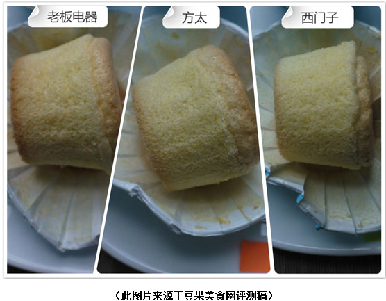 设定同样的烘烤时间、温度后,老板烤箱R015烤出来的纸杯蛋糕虽然底部略有上色,但组织膨发得不错。而其余两款产品烘焙出来的蛋糕虽然整体也不错,但是没有老板烤箱R015表现得这么完美。
