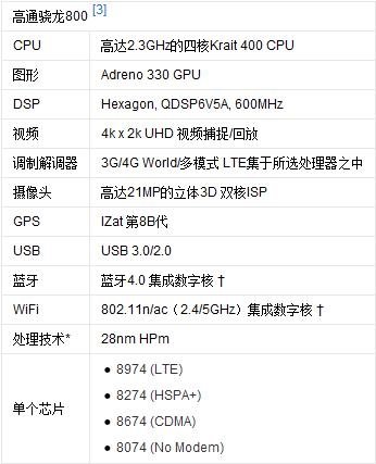 骁龙MSM8274AB大家可能平时了解的就不多了,因为这款处理器也是骁龙800系列的产品,所以在工艺制程方面与高通骁龙MSM8974AB是一样的,同样的2.3GHz的四核Krait 400 CPU以及Adreno 330 GPU。那么为什么两款处理器的型号是不一样的呢?这是因为两款处理器支持的网络制式是不同的。