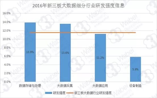 从细分行业来看,2016年研发强度最高的行业是数据存储与处理行业,达到13.9%;其次是数据采集行业,研发强度达13.6%,反观数据运用行业和设备制造行业,研发强度绝对较低,分别为11.2%和5.9%。