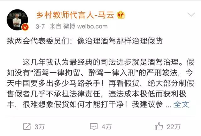 几个月才发一条微博的马云,专门发布的一篇《致两会代表委员们:像治理酒驾那样治理假货》长微博,短短数小时即获得10万网友点赞。3月7日,专门发布的一篇《致两会代表委员们:像治理酒驾那样治理假货》长微博,短短数小时即获得10万网友点赞。近日,马云致信两代表委员,呼吁“像治理酒驾那样治理假货”。