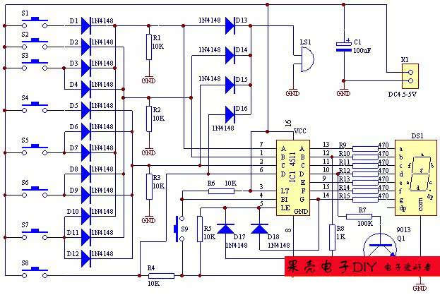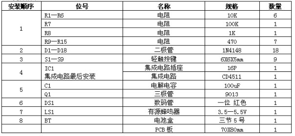 该抢答器电路可同时进行八路优先抢答。按键按下后,蜂鸣器发声,同时(数码管)显示优先抢答者的号数,抢答成功后,再按按键,显示不会改变,除非按复位键。复位后,显示清零,可继续抢答。元件清单淘宝卖家S1~S8 为抢答键;S9 为复位键;CD4511 是一块含BCD—7 段锁存/译码/驱动电路于一体的集成电路,其中1、2、6、7 为BCD 码输入端,9~15 脚为显示输出端,3 脚(LT)为测试验出端,当"LT"为0 时,输出全为1,4 脚(BI)为消隐端,BI 为0 时输出全为0,5 脚(LE)为锁存允许端,当LE 由"0"变为"1"时,输出端保持LE 为0时的显示状态。16 脚为电源正,8 脚为电源负。整个电路可以采用3.5-5.5V直流供电。