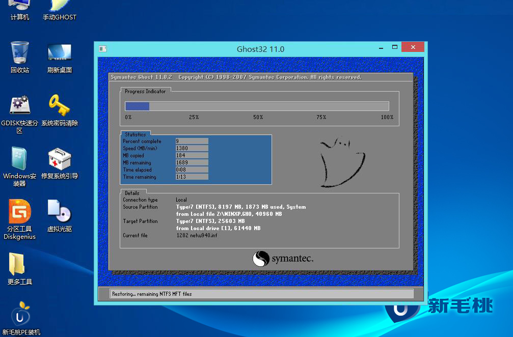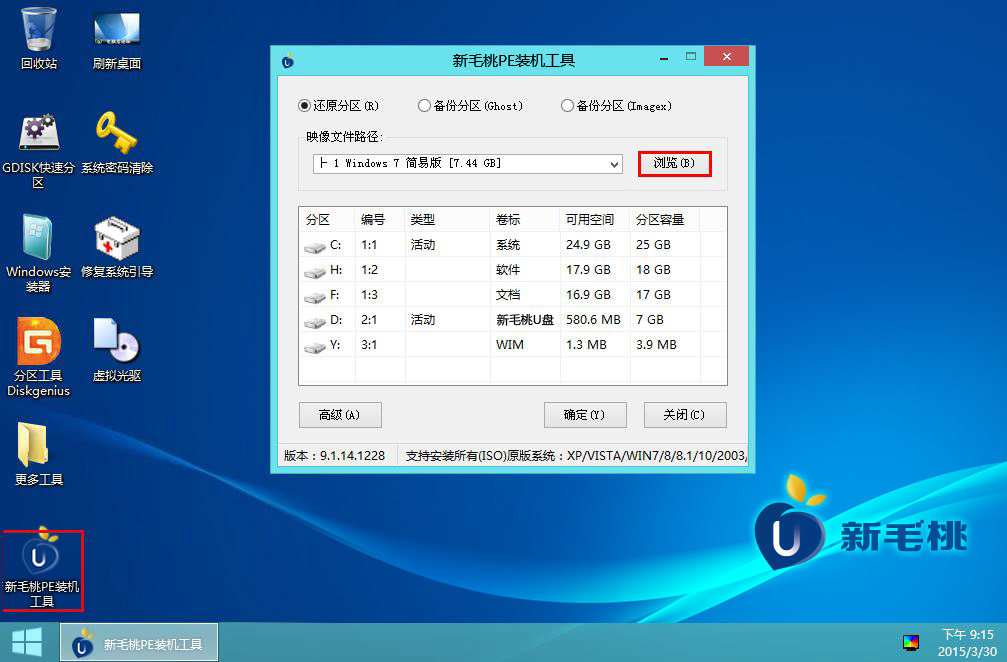 2、进入pe系统后,会自动加载老毛桃PE装机工具,若没有,请双击桌面上对应的图标。在工具窗口中点击“浏览”,如下图所示: