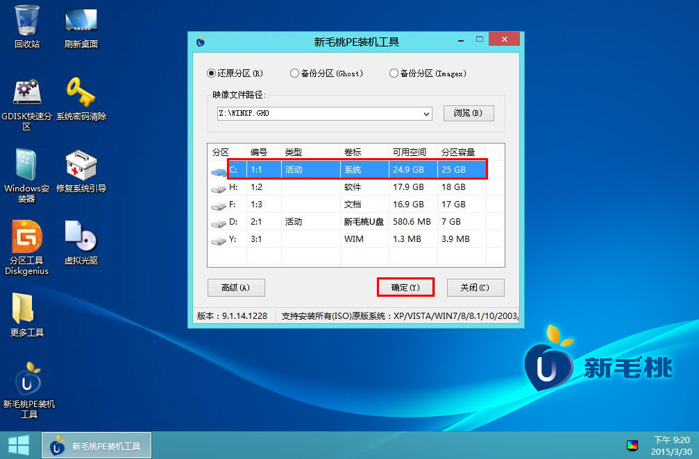 4、随后在磁盘列表中选中C盘用于存放系统镜像,点击“确定”按钮,如下图所示: