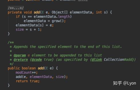 如图中所示,public boolean add(E e){}方法会执行modCount++;然后调用add(e,elementData,size)方法,最后返回布尔类型的ture。