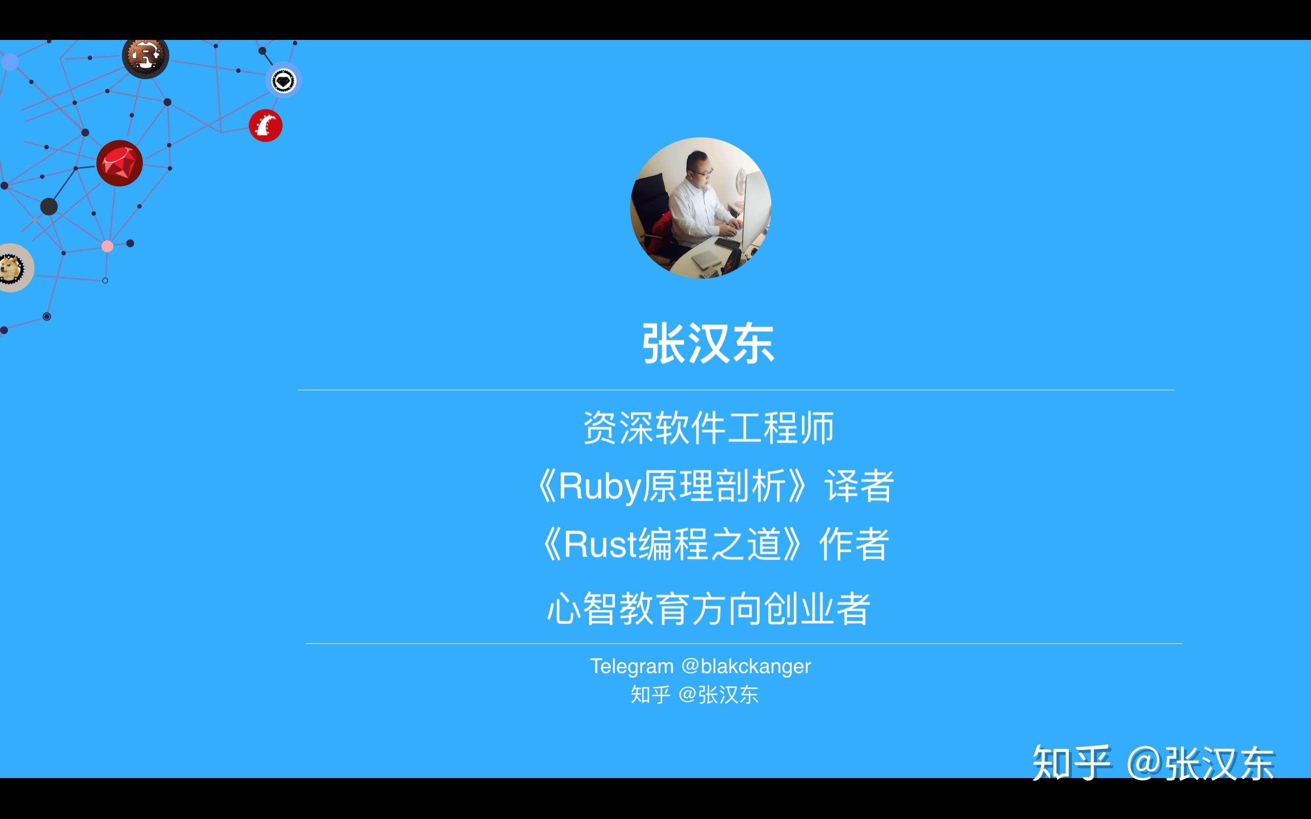 首先自我介绍. 我叫张汉东. 他是《 Ruby原理剖析》一书的翻译者,目前正在撰写《 Rust的编程方式》一书,该书预计将于今年12月出版. 目前,他正在开展青年心理教育领域的业务,并试图通过编程来改善心理教育.