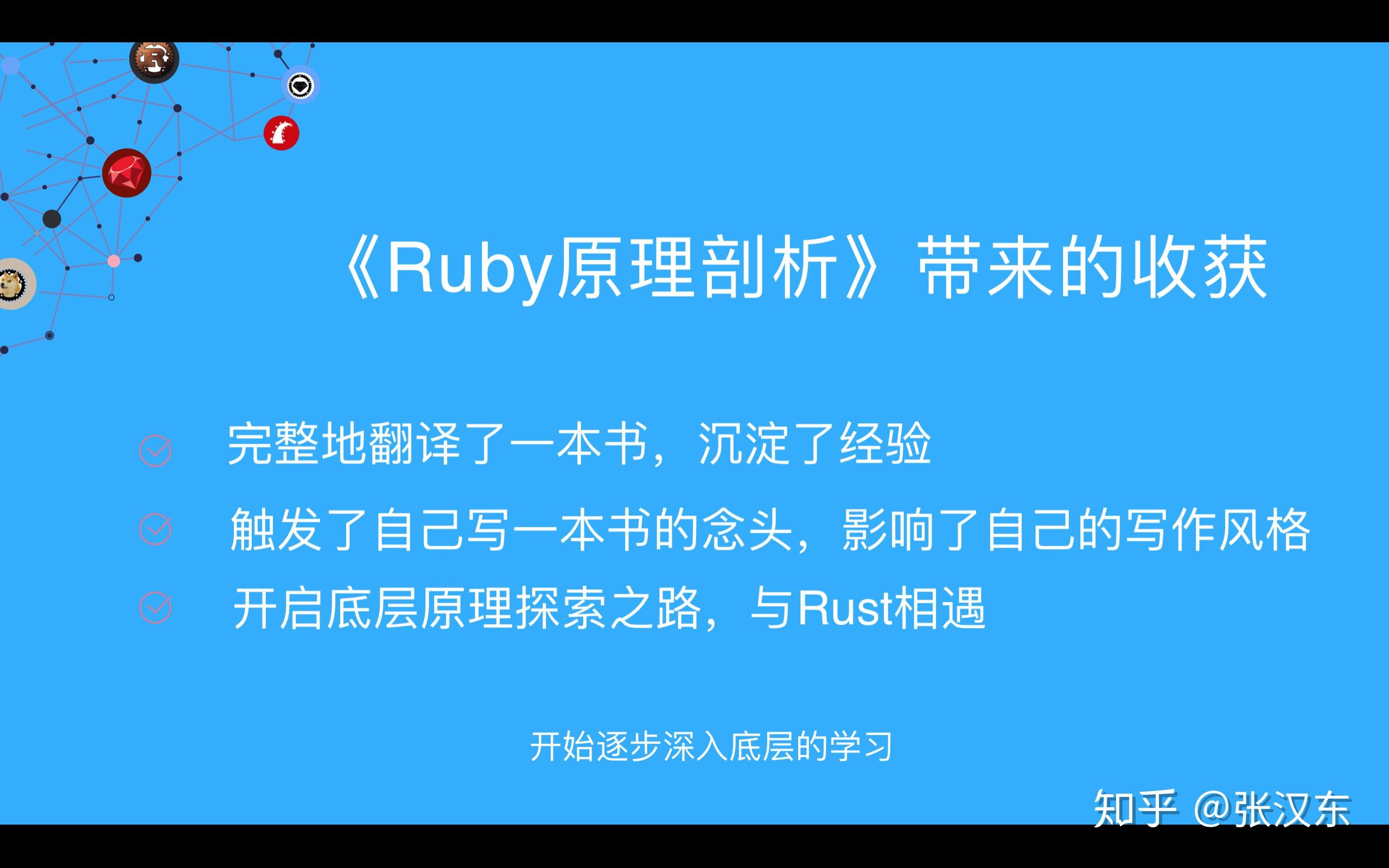 尽管我喜欢Ruby,但是Ruby的性能始终受到批评. 我一直在寻找像Ruby这样具有高度抽象性的语言,并且具有与C相同的强大性能. 我没想到会找到它. Rust 1.0是在2015年发布的. 我立即开始关注Rust. 正是“ Ruby原理剖析”使我踏上了低级探索的旅程. 我从这本书中学到的知识也帮助我快速掌握了Rust.
