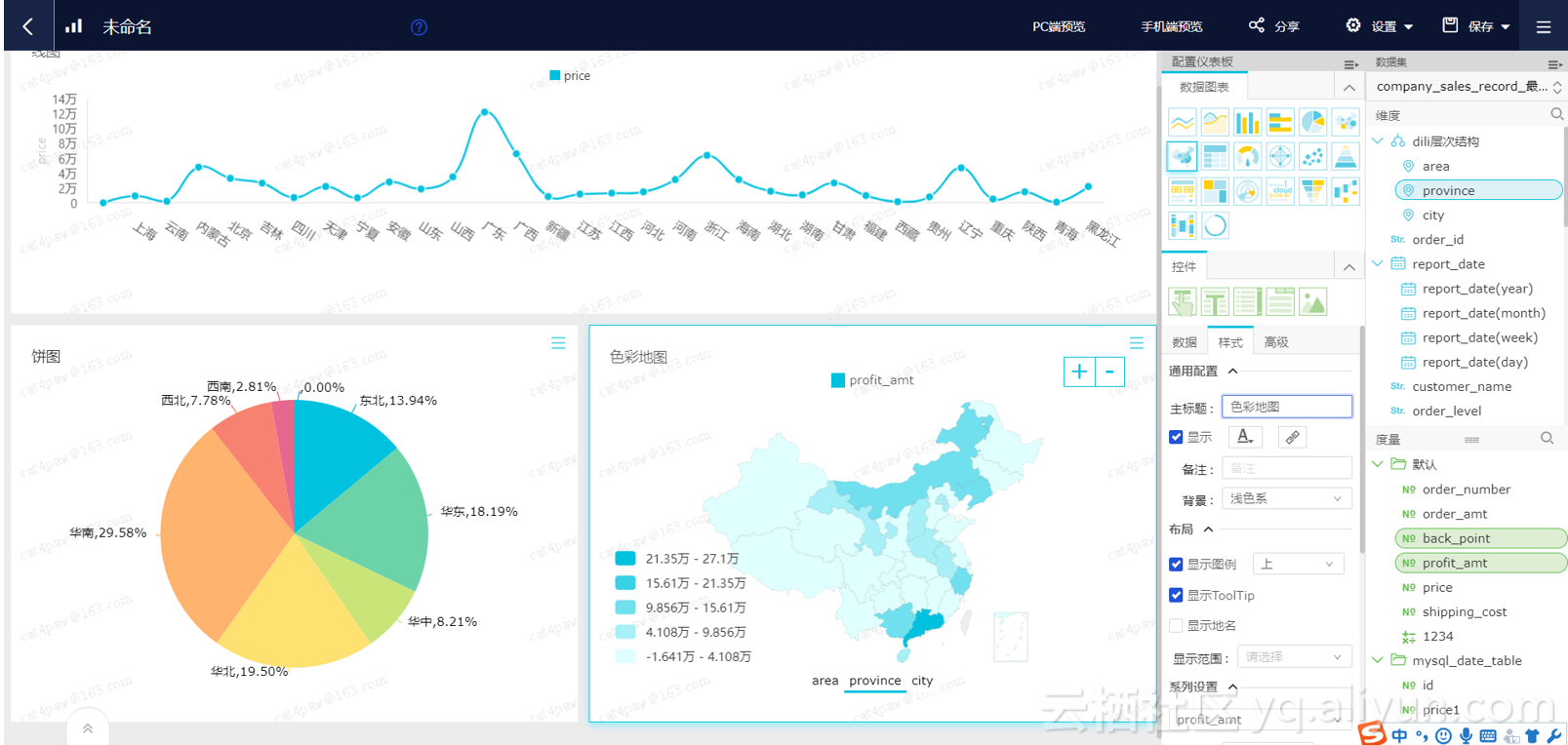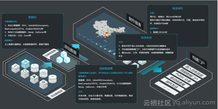 添加数据源: BI支持多个数据源访问. 主要有三种类型: 云数据源,用户构建的以及通过触摸空间上传到平台以提供数据分析服务的用户本地文件. 创建数据集: 与数据源建立连接后,您可以处理表,并巩固表的处理以避免重复操作. 报表制作: 整个报表制作分为两个模块,分别是类似于Excel的编辑表和带有可视化分布图的仪表板. 电子表格和仪表板均可提供强大的数据分析服务. 报告应用程序: 完成电子表格或仪表板后,您可以将这些电子表格或仪表板构建到数据门户中. 在数据门户中,您可以无缝集成用户想要显示的报告. 所有报告也可以由第三方使用. 嵌入式集成,除提供各种报告功能外,还与用户自己的平台无缝集成.