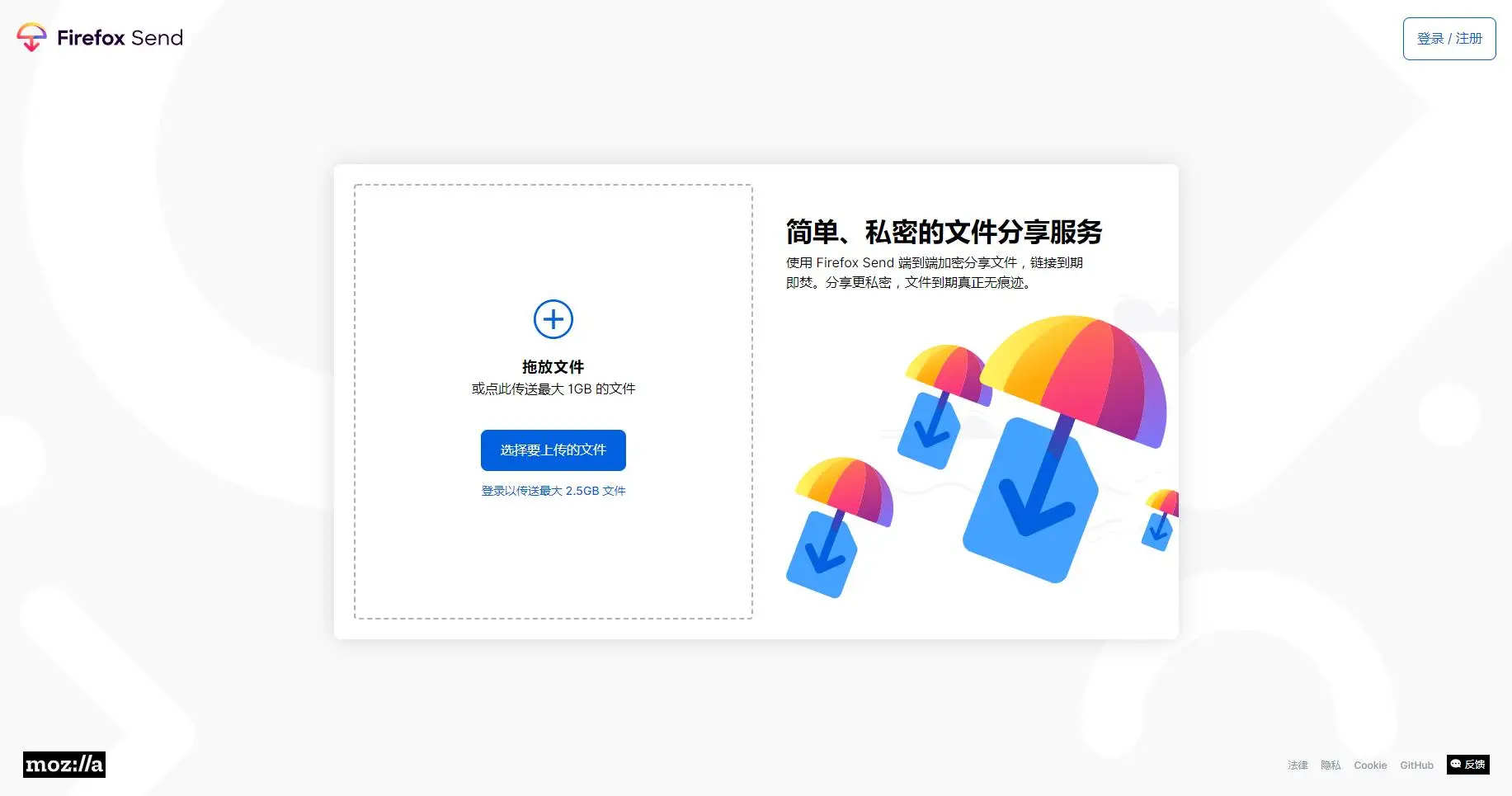 Send是由Firefox Labs开发的临时网络磁盘服务,可用于共享最大1G的文件. 您可以加密共享文件临时免费网络硬盘,并且共享文件最多下载20或24小时后将自动过期. 而且,无需注册,无需安装任何软件或任何工具,博客作者会感觉很好,使用Firefox发送端到端加密来共享文件,当链接过期时,链接将被刻录. 共享更加私密,文件过期无踪.