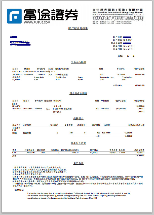 由于英语是香港的官方语言之一,因此大多数证券公司的日常报表中都有英文声明,这给大陆投资者带来了一定压力,所以让我们在这里进行比较.