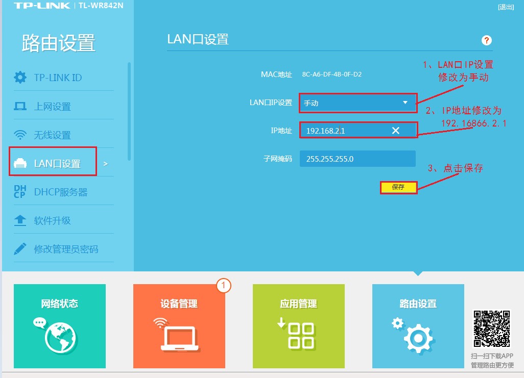 6. 修改路由器的管理地址(LAN端口IP地址设置),以防止网络设备之间的地址冲突. 方法单击“ LAN端口设置”-将“ LAN端口IP设置”修改为“手动”,可以将IP地址和子网掩码地址定义为192.168.2.1(也可以是其他值),单击“保存设置”(注意以后登录路由器使用修改后的地址),如下所示;