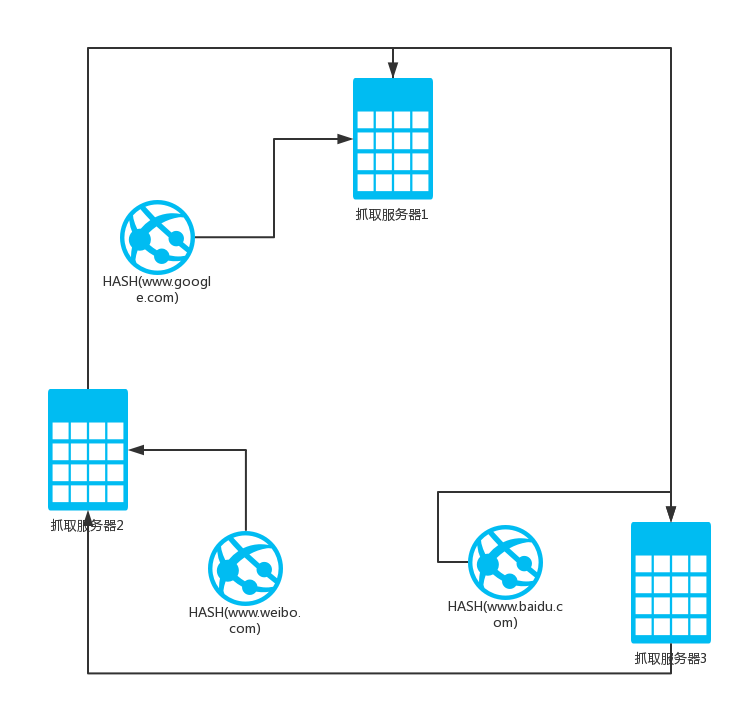 现在假定服务器2收到域名weibo.com. 在哈希计算之后,服务器2知道它在其管辖范围内,因此它自己下载URL. 此后,服务器3收到baidu.com. 经过哈希计算后,服务器3确认属于2号管辖区,然后将该URL转发给服务器2. 如果2号服务器的驱动程序未收到3号服务器的响应,它将根据该地址临时搜索. 环的大小顺序,然后将URL转发到遇到的第一个服务器,即第一台服务器. 之后,服务器2的下载任务将暂时移交给服务器1,直到服务器3重新启动.