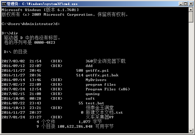4. 此时,在cmd中输入dir,您可以在d驱动器下看到每个文件的名称.