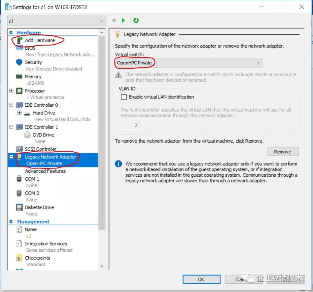 配置c1,添加一个网卡,选择添加旧版网络适配器,然后将其添加到OpenHPC专用网络中.