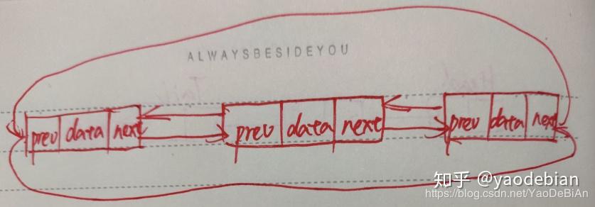 即双向链表和循环链表的组合,如图所示:
