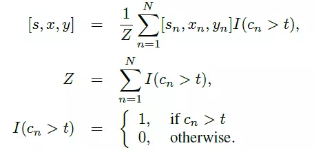 此网络用于窗口校正,它使用三个偏移变量: Xn: 水平偏移量,Yn: 垂直偏移量,Sn: 纵横比缩放. 在候选帧(x,y,w,h)中,(x,y)代表左上点的坐标,而(w,h)代表宽度和高度.