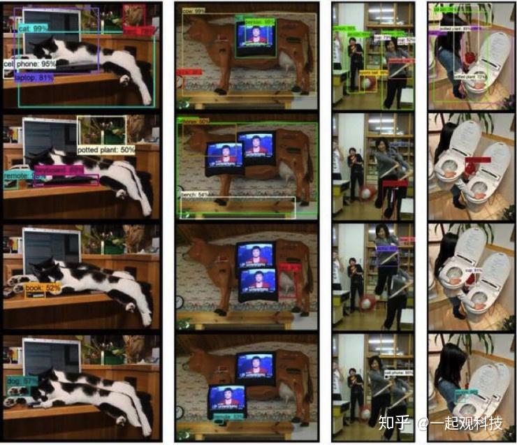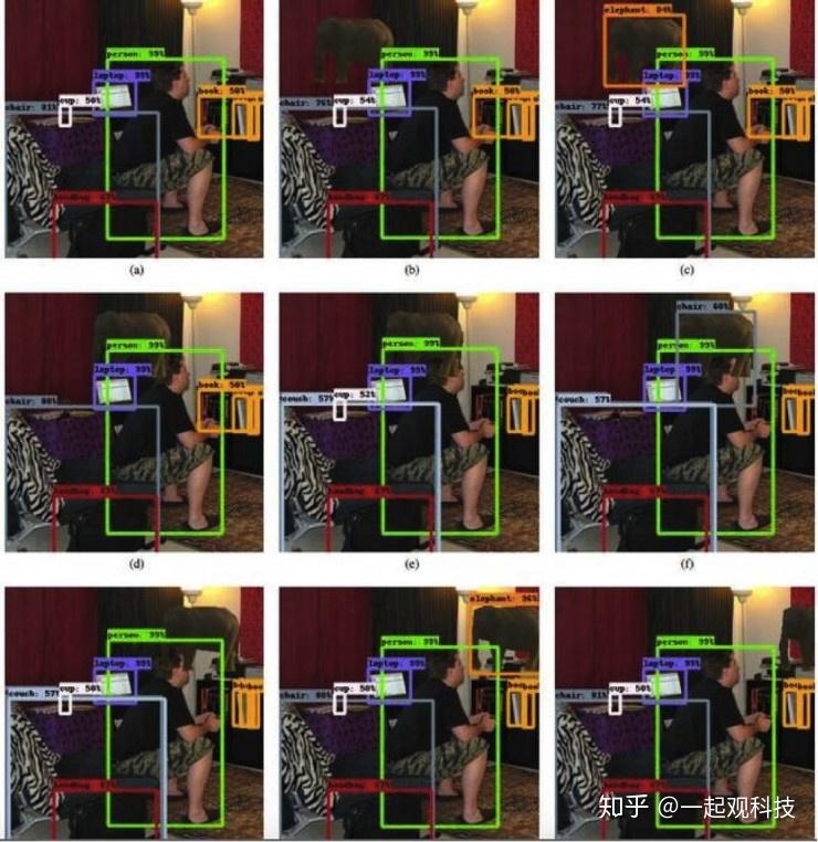 在第一个示例中,研究人员将大象的图像添加到了坐在客厅里的男人的图像上. 该模型输出围绕不同目标的一系列彩色边界框,并计算出不同目标识别结果的可能性. 它确定了人类和笔记本电脑的目标为99%,椅子为81%图像识别 c,手袋为67%,书本和杯子为50%.