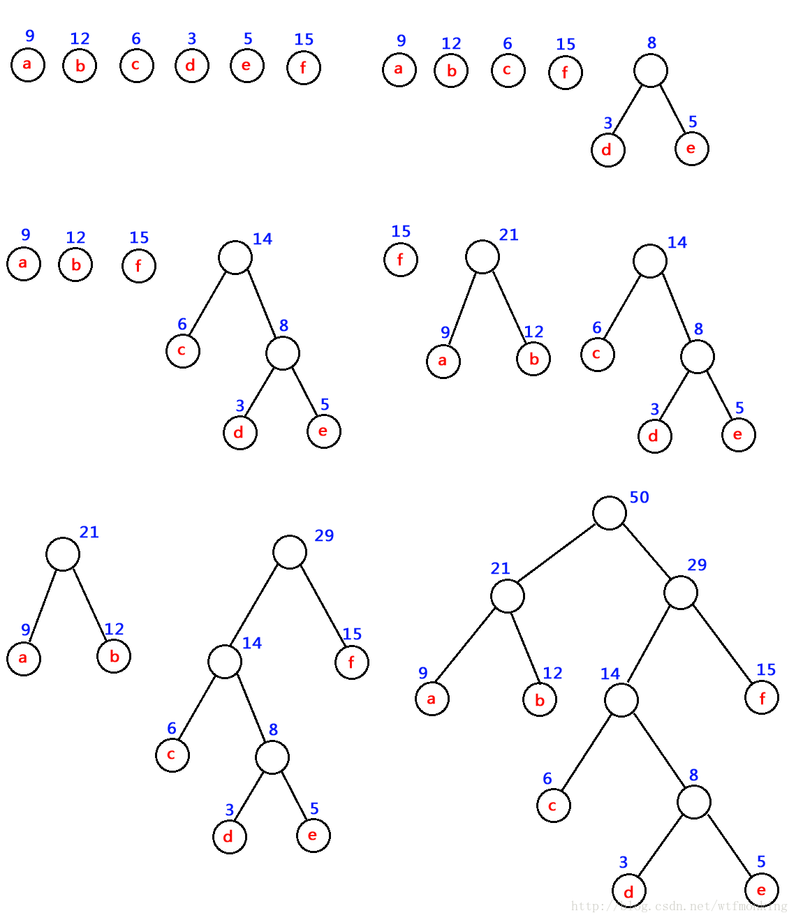 如:对 下图中的六个带权叶子结点来构造一棵哈夫曼树,步骤如下: