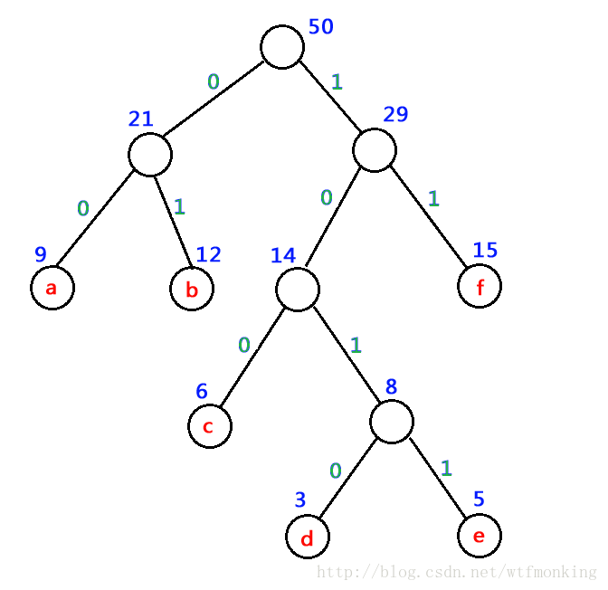 所经分支的0、1编码序列等于该叶子结点的二进制编码。如上文所示的哈夫曼编码如下: