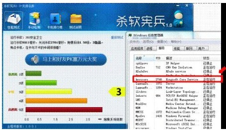 如图二中,金山毒霸根本无法完全关闭,而是强驻内存空耗系统资源。杀软宪兵即便用户选择“退出”金山毒霸,它的kxescore服务项仍然在后台隐蔽运行,而且起不到任何安全防护作用。这也解释了在同时安装金山毒霸和其他安全软件的情况下,金山毒霸在“杀软宪兵”的检测中大占上风的原因。