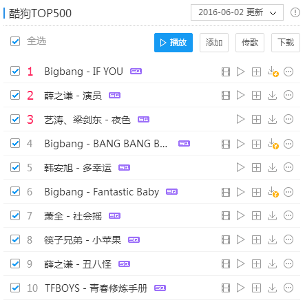 Bigbang的这首《If you》不同于以往的快节奏high歌,而是以舒缓悲伤的曲风戳中人心。创作出这首歌的权志龙也曾表示“这是一首有意义的歌曲,大家都曾爱过”,平静中带着哀伤让许多歌迷听完以后表示感同身受。而薛之谦的《演员》更是唱尽爱情的无奈心酸,听哭了一票网友,有歌迷甚至表示“听一次哭一次”,可见薛之谦的情感表现力之丰富,演唱功力之厚重。酷狗top500