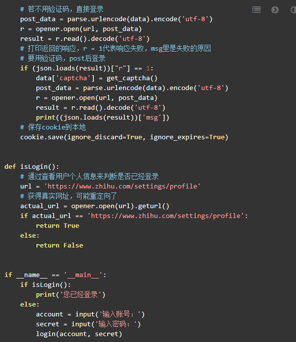 您可以通过time.time()查看当前时间戳. 例如,我现在是1471771678.5400066,看它是否非常靠近上面的红色框!通过转换关系t = time.time()* 1000,可以获得图片链接的关键部分,其余部分保持不变. 验证码的完整地址为captcha_url ='zhihu.com / captcha.gif?r ='+ t +“&type = login”. 好的,链接是已知的,只需下载,查看并手动输入即可. 这篇文章之后,您应该能够成功登录,感到非常兴奋.