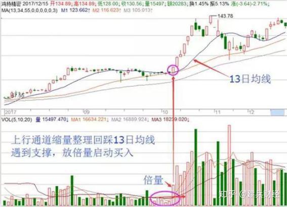 单个股票正在上涨,当它们的交易量无法持续扩大时,它们将在较小的价格范围内累积几天的交易量,从而超过前一个高点,从而形成了收缩和整理的上升通道,并获得了13、34、55日均线系统的强劲支撑. 上升通道的下轨恰好是13天移动均线的零偏差位置,后市的上行空间是中短线的绝佳买入点. 如下图所示: