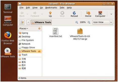 桌面上会出现WMware Tools 图标,打开,看到安装包,拷贝到一个可读可写的目录,如桌面解压: