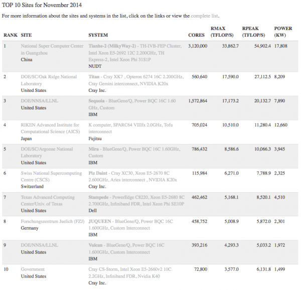 6、本次榜单有50台超算的运算速度超过千万亿次,而上次榜单是37台,一年前是31台。top500计算机