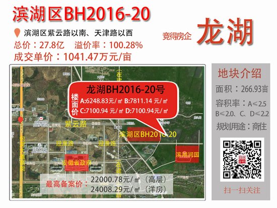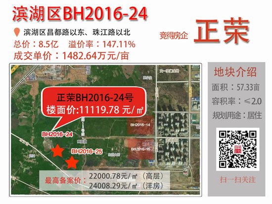 正好置业以总价8.5亿元收购了滨湖BH2016-24号地块. 这是继上月14日的阴谋之后,滨湖正荣房地产获得的第二个土地. 楼面地价为每平方米11,120元,远高于相邻的滨湖BH2016-25,也高于上月获得的14号地块.