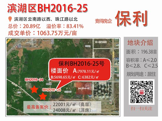 点评: 保利地产以20.89亿元的总价夺得滨湖区BH2016-25地块,最高住宅楼面地价为每平方米7978元. 正如前面在关于Lot 24的评论中所提到的,两个几乎彼此“不分离”的连用地块最终由两家房屋公司赢得.