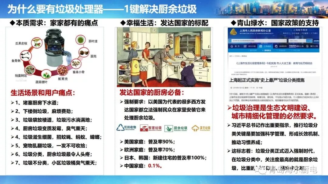 中国的垃圾处理器普及率极低,市场前景广阔. 目前,许多以美国为代表的西方发达国家已制定法律,迫使人们将其安装在家里以处理厨余. 它已成为现代家庭以及微波炉,烤箱和抽油烟机等厨房电器的必需品. 美国的垃圾处理普及率达到90%,欧洲达到70%,日本和韩国的新房普及率达到100%. 但是,食物垃圾处理器在中国家庭中的普及率仅为0.1%.