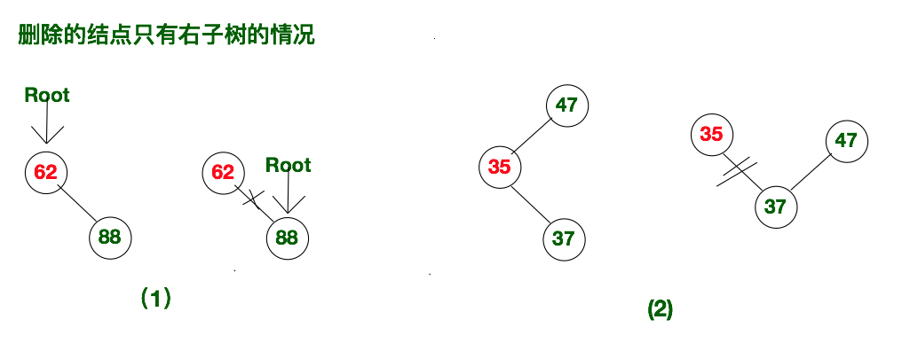 该情况也可以细分为两类,一种是该删除的结点没有父节点,也就删除的节点为根节点,我们需要将根节点的root指针指向即将删除结点的右孩子,然后将删除结点的rightChild置空即可。