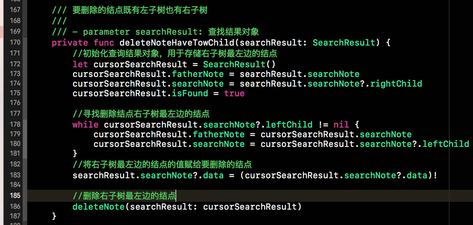 接下来我们就要实现要删除的结点有两个子节点的情况,这种情况上面我们已经分析过了,实现起来并不复杂。下方这个deleteNoteHaveTwoChild()方法就是删除有两个子节点的情况,该方法的参数是查找的我们要删除的结点的查找结果。其实就是查找,替换和删除三个步骤。下方代码可以分为以下几步: