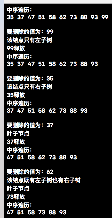 上述代码的输出结果为,从最后一个输出结果我们可以看出,我们要删除的结点62既有左子树也有右子树,所以寻找62右子树上最小的值73,然后将62进行覆盖。最后把62右子树上的73进行释放掉即可。