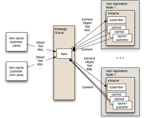 原理:这种模式的核心就是一个消息队列,每个应用节点都订阅预先定义好的主题,同时,节点有元素更新时,也会发布更新元素到主题中去。各个应用服务器节点通过侦听MQ获取到最新的数据,然后分别更新自己的Ehcache缓存,Ehcache默认支持ActiveMQ,我们也可以通过自定义组件的方式实现类似Kafka,RabbitMQ。