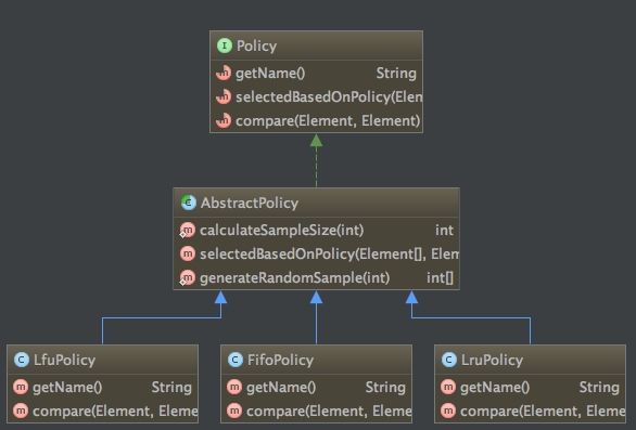 从类上看一共有三种缓存淘汰策略分别是:LFU,LRU,FIFO。关于这三个概念在前面都已经有过解释,我们直接这三个的源码: